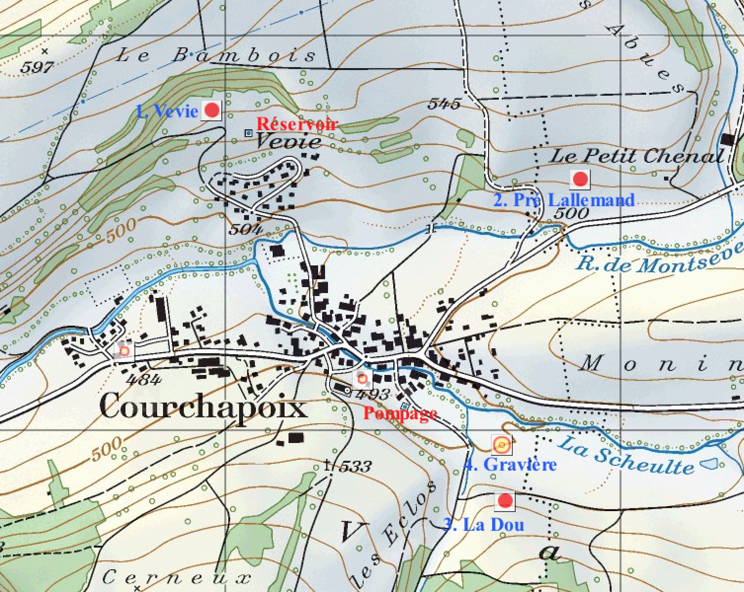 4. Gravière : nappe phréatique, eau remarquée dans les drainages par Maeder, captée en 1958. C’est la principale possibilité d’obtenir de l’eau. Cette eau est pompée dans la nappe phréatique qui s’étend entre Courchapoix et Corban. En surface, une zone de protection est délimitée.